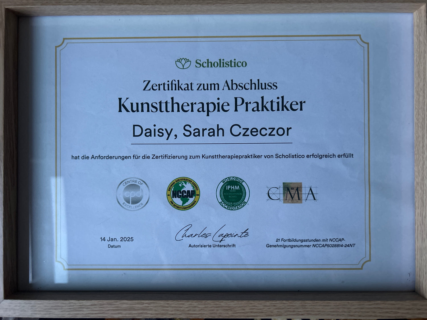 Mein Künstlername „Daisy Art Czeczor“ verbindet Geschichte, Familie und meine persönliche Identität mit meiner künstlerischen Vision. Mein zweiter Name Sarah wird dabei durch das Wort Art ersetzt – ein bewusstes Zeichen, dass Kunst ein fester Teil meiner Persönlichkeit und meines Lebens ist.