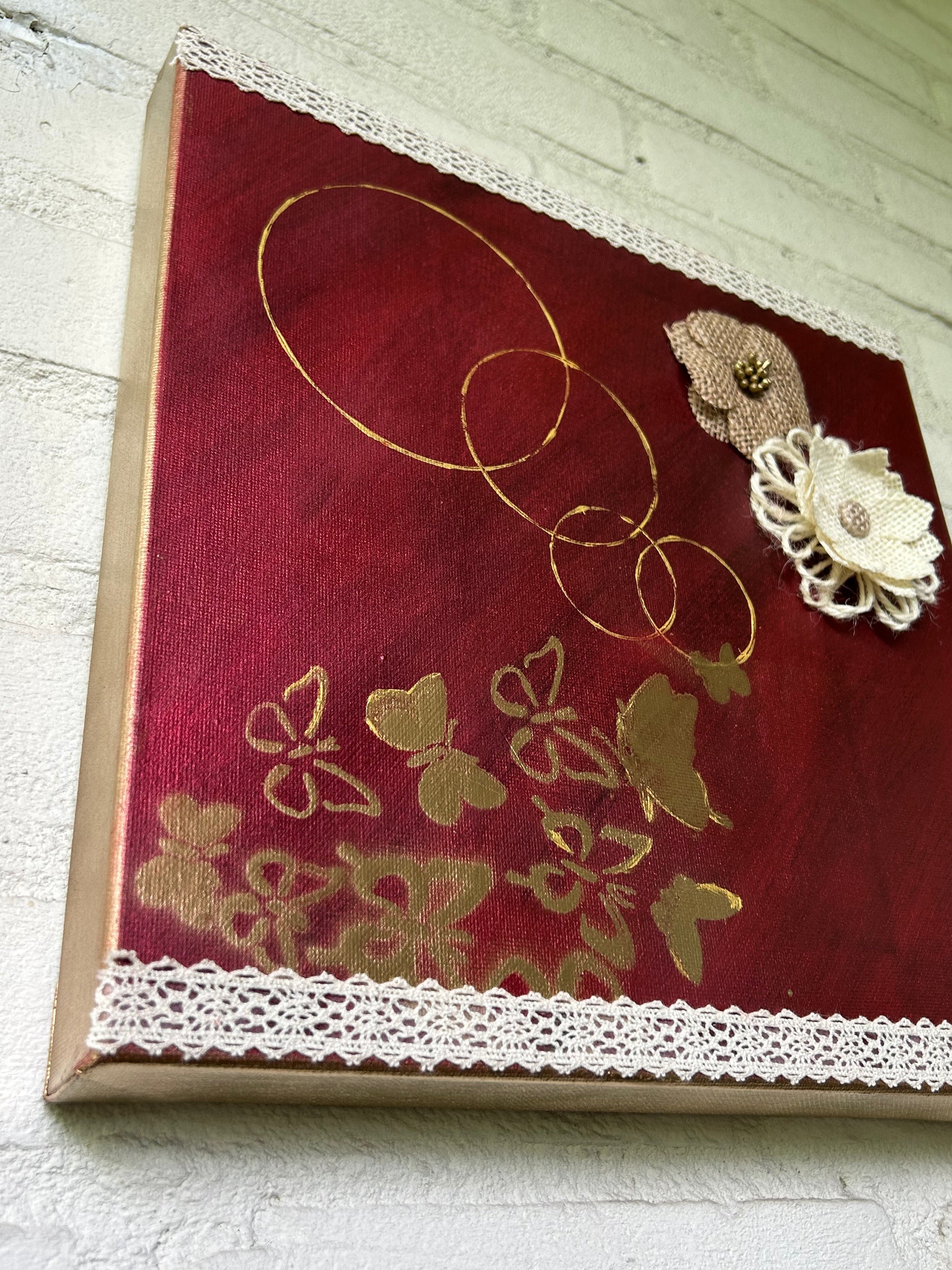 Die goldenen Schmetterlinge tanzen nicht nur als Symbol der Freiheit über die Leinwand, sondern erzählen von Transformation, Leichtigkeit und dem Mut, sich aus dem Innersten heraus zu entfalten.